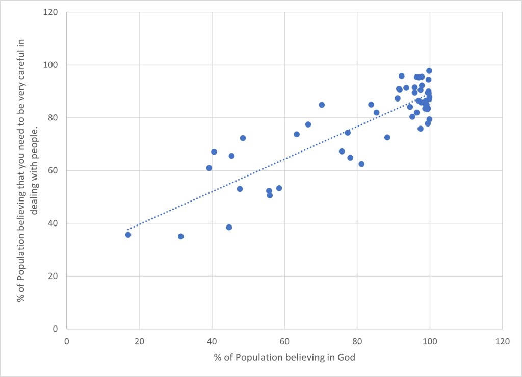 For the 54 countries where both sets of data exist, the graph below compares two sets of data from the most recent World Values Survey, i.e., the percentage of national population who believe that you need to be very careful in dealing with people (Q57), and the percentage of the population who believe in God (Q165). The coefficient of correlation here is 0.86 which indicates a strong relationship.