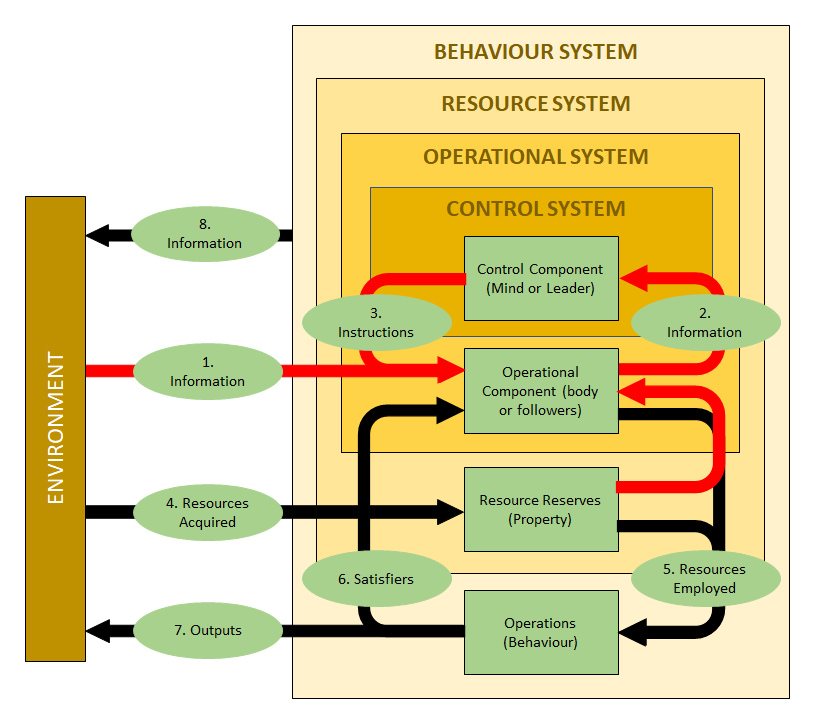 The behaviour system is part of a nested hierarchy comprising other systems. They are arranged as follows. The control component, in the case of an individual, is his mind, and in the case of a larger organisation, its leader. Together, the mental and physical resources that they directly control, i.e., the body of an individual or the people in a larger organisation, comprise the operational system. The operational system, together with the resources that it owns, comprise the resource system. Finally, the behaviour system comprises the resource system plus actual behaviour.