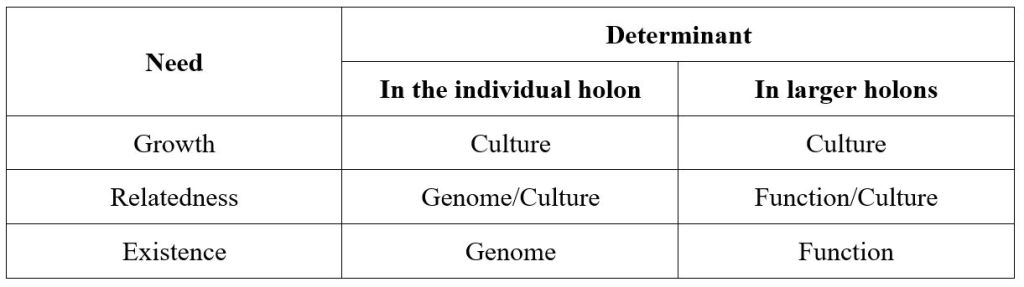 Suppose we have two social holons, X and Y. The more similar their determinants, the more similar their needs. Individual human beings are, of course, genetically very similar and our existence needs are therefore almost identical. The functions of larger social holons or organisations are more diverse, and it is rarer, but still possible, for two to have identical needs. The relatedness needs of individuals, i.e., how we interact with others, are determined in part by the genome and in part by culture. This is evidenced by the fact that some cultures value the extended family more than others. Again, the relatedness needs of larger social holons are more diverse. They are influenced by a combination of the holon’s function and culture. Finally, the growth needs of both individuals and larger social holons are influenced largely by culture. Growth needs can be very diverse in both cases.