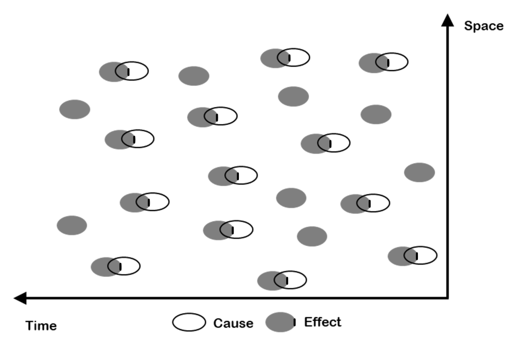 Fig.1 A space-time diagram showing instances of a sufficient cause as white ellipses, and instances of the effect as black lines at the beginning of events shown by grey ellipses.